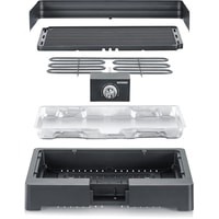 Настольный гриль с решеткой.Быстрое приготовление на гриле благодаря короткому времени нагрева - в помещении и на открытом воздухеОтсутствие риска ожогов на поверхности благодаря кожуху SafeTouchРебристая решетка для идеальных результатов приготовления на грилеПростая очистка благодаря множеству съемных компонентов.Благодаря полноразмерному нагревательному змеевику настольный гриль имеет равномерное распределение тепла и обеспечивает низкий уровень дыма и запаха, когда поддон для гриля заполнен водой.Помимо ребристой пластины для гриля, этому практичному настольному грилю присущи быстрый нагрев и высокие температуры. Нагревательный элемент с термостатом и регулятор температуры, а также нагревательный змеевик по всей длине делают это легко. Легкость сборки.